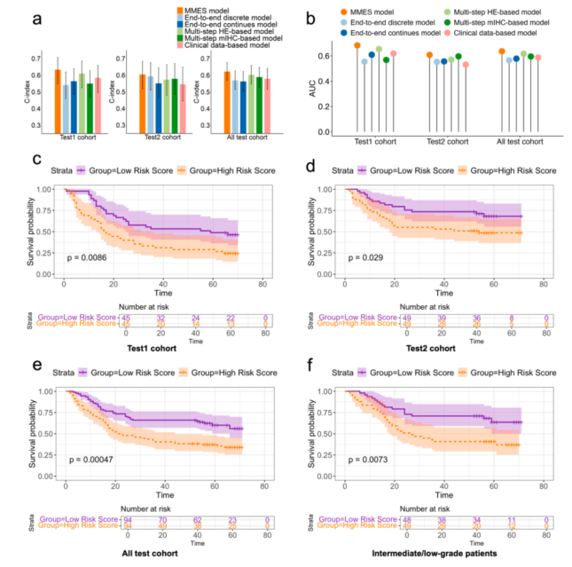 研究显示,MMES模型在测试队列中的表现显著优于端到端多模态模型。在总体测试集上,MMES模型的一致性指数为0.622,高于端到端离散模型(0.569)和连续模型(0.563),提升幅度为9.9%;其平均时间依赖AUC为0.636,同样较端到端模型提高了11.3%。进一步分析表明,多模态整合带来了明显优势。单模态模型(HE为0.602,mIHC为0.589)以及仅基于临床资料的模型(0.579)均低于MMES模型,提示HE与mIHC的互补性能够显著提升预后预测性能。值得注意的是,HE特征对预后的贡献度高于mIHC,这与HE特征提取依赖于大规模预训练模型,而mIHC特征提取需在小样本下从头训练有关。然而,两者结合能显著增强模型的鲁棒性。此外,验证了MMES模型风险评分的独立预后价值。Cox回归分析显示,HE风险分数和mIHC风险分数均为显著预后因子,其风险比值分别为36.49和3.23,均具有高度统计学意义。根据风险评分中位数将患者分为高低风险组后,无论在单个测试队列还是合并队列中,均可显著区分患者的生存差异。尤其是在预后较难判断的中低分级患者中,风险评分依旧表现出良好的区分能力。