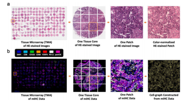 在研究设计方面,共纳入456例胃癌患者的多中心组织芯片样本,所有患者均经病理确诊,并具备完整的随访信息。每例患者的样本包括一张HE染色切片和一张七色六标记的mIHC切片,标记物涵盖CD68、CD163、CD8、FOXP3、PD-L1及panCK。根据时间顺序,患者被划分为训练队列和两个独立的测试队列。此外,研究还引入TCGA-STAD队列中的354例患者全视野切片,以评估模型的迁移能力。