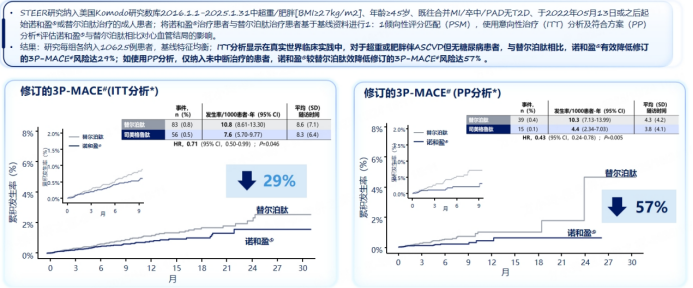 研究结果显示:在意向性治疗(ITT)分析中,与替尔泊肽相比,司美格鲁肽2.4mg显著降低修订的3P-MACE(包括心肌梗死、卒中、全因死亡)风险达29%。在更严格反映持续治疗效果的符合方案集(PP)分析中,司美格鲁肽2.4mg组的风险降幅更为显著,达到57%(图3)。STEER研究作为最新发布的重要真实世界证据,有力地印证了司美格鲁肽2.4mg在真实临床环境下对合并心血管疾病的肥胖患者所具有的心血管保护作用。