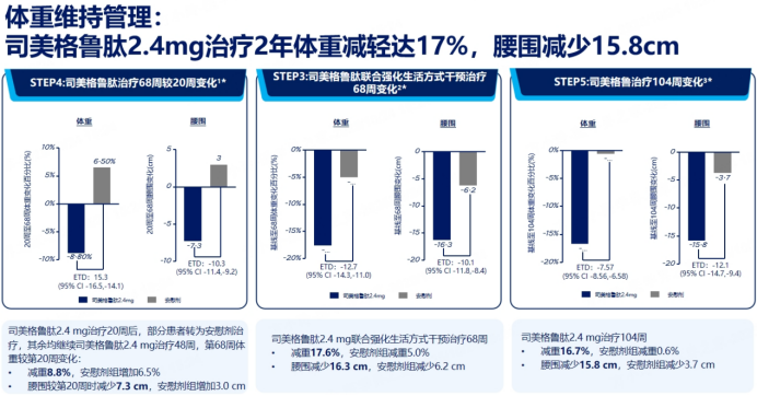 正是在这一严峻的临床挑战下,司美格鲁肽2.4mg的长期疗效数据提供了关键性的解决方案。STEP系列随机对照研究[3-5]作为其疗效的基石,已证实其可持续减重并维持效果至少长达2年,平均减重幅度可达17%(1/3患者减重幅度超过20%),腰围减少15.8cm(图1)。