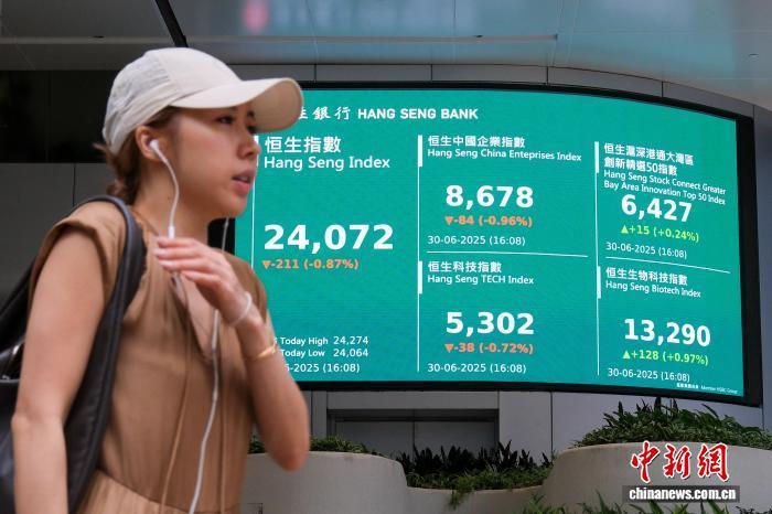 7月29日,香港交易及结算所有限公司表示,今年上半年,其全资附属公司香港联合交易所有限公司平均每日成交金额达2402亿港元,同比增长118%。图为6月30日,2025年上半年最后一个交易日,香港恒生指数收市报24072.28点。(资料图) 中新社记者 陈永诺 摄